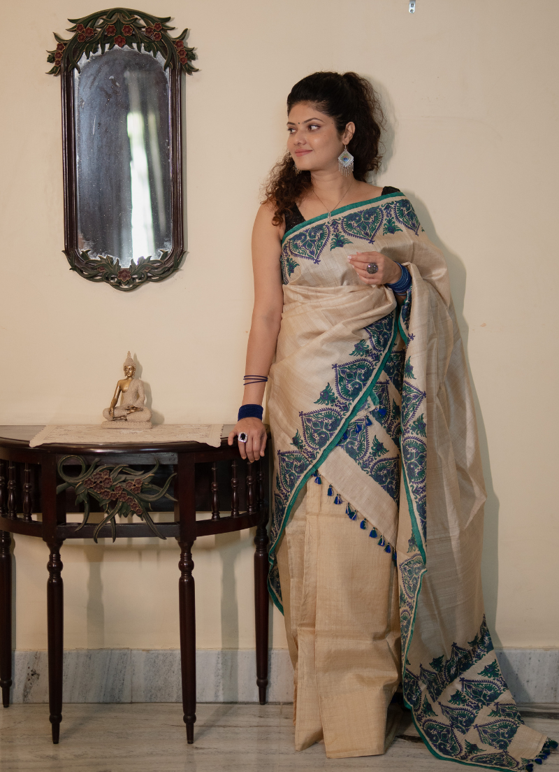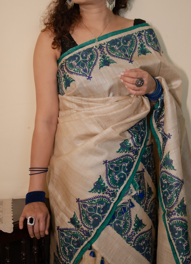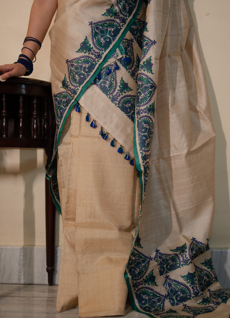 Single pure tassar sador in king khap design with silk mark tag (Hand block print)