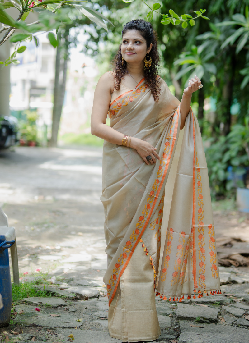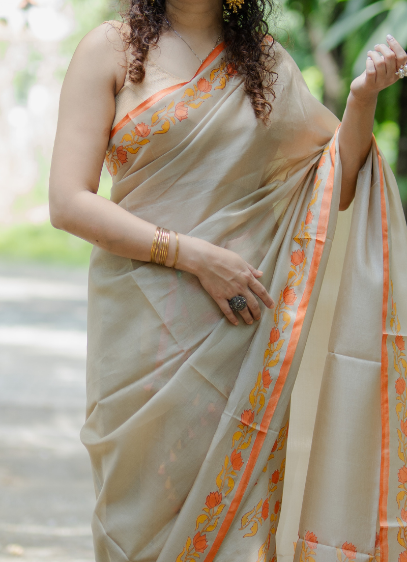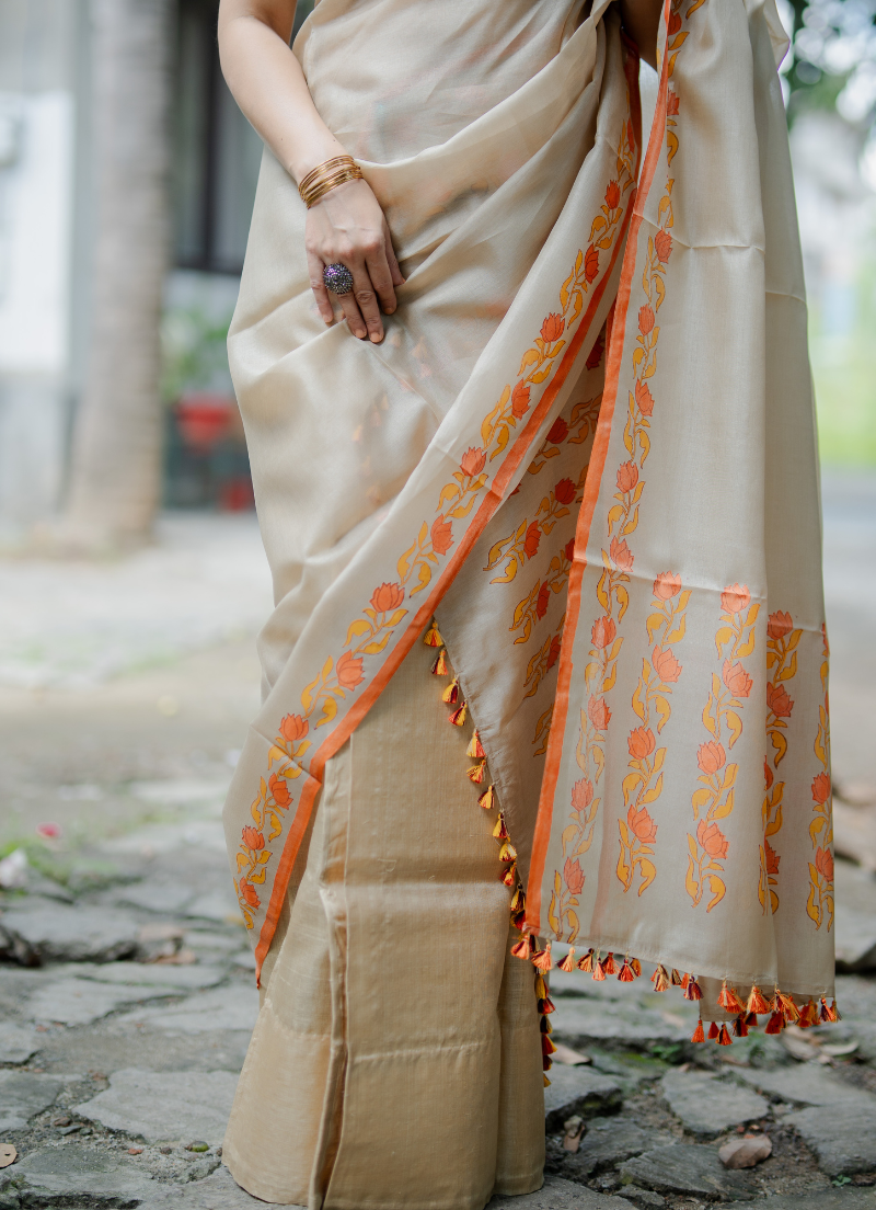 Single pure silk sador with floral design with silk mark tag (Hand block print)